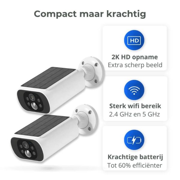 De camera's hebben een ingebouwd zonnepaneel en een oplaadbare batterij. Bij normaal gebruik houdt het zonnepaneel de batterij op peil. Op plekken met weinig zon kun je de camera ook opladen met een USB-kabel.