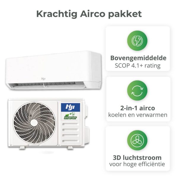 Dit doe-het-zelf airco pakket bestaat uit een single split airco die kan koelen en verwarmen. De airconditioning heeft een vermogen van 2,5 kW en bestaat uit een krachtige Hji buitenunit, een binnenunit, een standaard 3 meterleidingset, een WiFi-module, een muurbeugel en alle benodigde bekabeling en aansluitmaterialen.