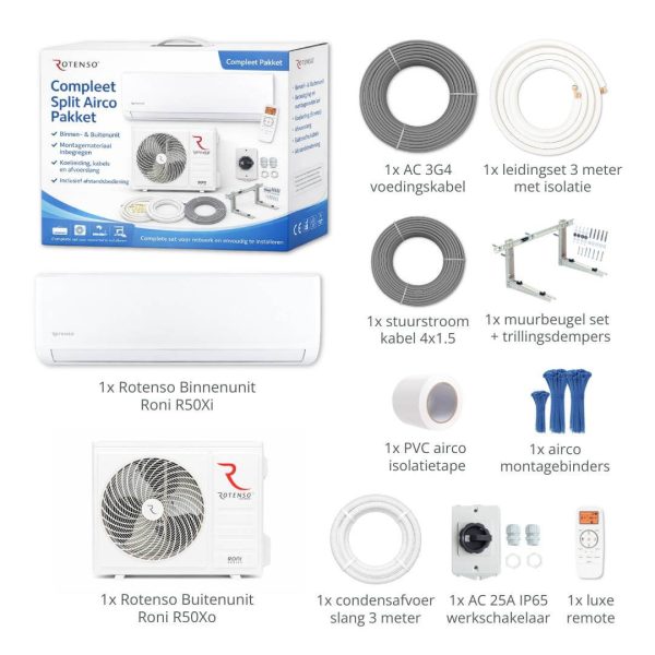 Dit doe-het-zelf airco pakket bestaat uit een single split airco die kan koelen en verwarmen. De airconditioning heeft een vermogen van 5,1 kW en bestaat uit een krachtige R50Xo buitenunit, een binnenunit, een standaard 3 meterleidingset, een WiFi-module, een muurbeugel en alle benodigde bekabeling en aansluitmaterialen.