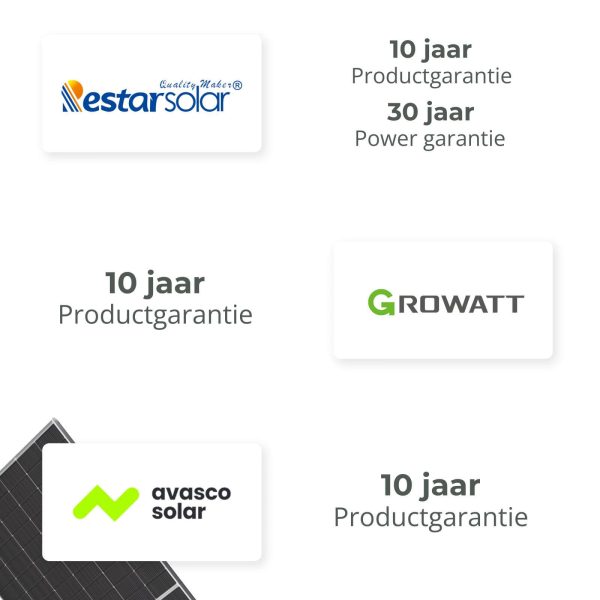 Voor dit pakket gelden de gebruikelijke fabrieksgaranties op zowel de zonnepanelen, omvormer, onderstel en overige componenten. Zo ben je verzekerd van betrouwbare producten en extra zekerheid.