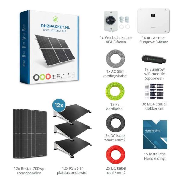 Het pakket bestaat uit 12 krachtige Restar 700 Wp zonnepanelen, een Sungrow 3-fasen omvormer, een wifi monitoring module en alle benodigde bekabeling en montagematerialen.