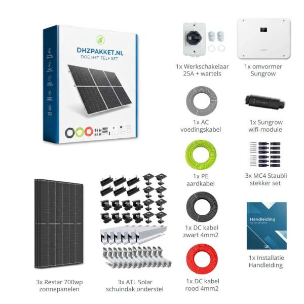 Het pakket bestaat uit 3 krachtige Restar 700 Wp zonnepanelen, een Sungrow (1 fase) omvormer, een wifi monitoring module en alle benodigde bekabeling en montagematerialen.