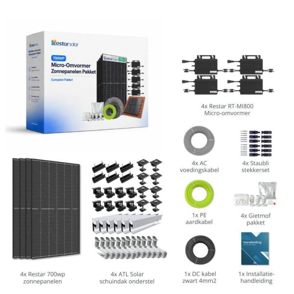 Dit doe-het-zelf zonnepanelen pakket is geschikt voor schuine daken. De set levert een verwachte opbrengst tot ongeveer 2800 kWh per jaar. Het pakket bestaat uit 4 krachtige 700 Wp TOPCON zonnepanelen, 4 micro-omvormers met wifi monitoring en alle benodigde bekabeling en montagematerialen. Hiermee heb je alles in huis om direct te starten met de installatie.