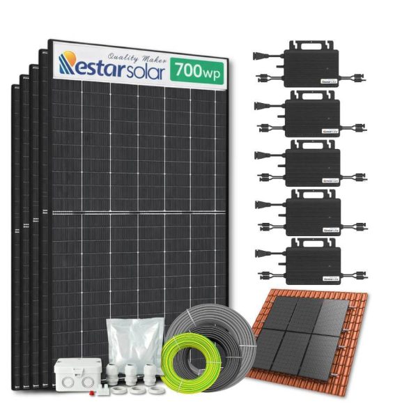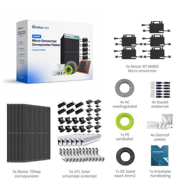 Dit doe-het-zelf zonnepanelen pakket is geschikt voor schuine daken. De set levert een verwachte opbrengst tot ongeveer 3500 kWh per jaar. Het pakket bestaat uit 5 krachtige 700 Wp TOPCON zonnepanelen, 5 micro-omvormers met wifi monitoring en alle benodigde bekabeling en montagematerialen. Hiermee heb je alles in huis om direct te starten met de installatie.