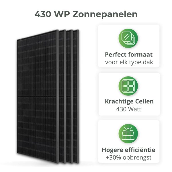 Met 8 panelen bereik je een totaal vermogen van 3440 Wp. Daardoor heb je minder panelen nodig om hetzelfde vermogen te halen,