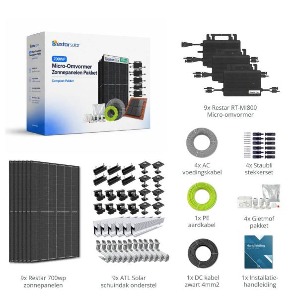 Dit doe-het-zelf zonnepanelen pakket is geschikt voor schuine daken. De set levert een verwachte opbrengst tot ongeveer 6300 kWh per jaar. Het pakket bestaat uit 9 krachtige 700 Wp TOPCON zonnepanelen, 9 micro-omvormers met wifi monitoring en alle benodigde bekabeling en montagematerialen. Hiermee heb je alles in huis om direct te starten met de installatie.